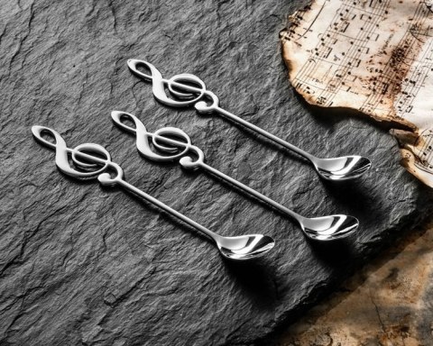 - smukłe metalowe łyżeczki z rączką w kształcie klucza wiolinowego